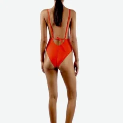 his ultra luxury one piece is made of fine Italian fabric. This stunning one piece is made in this stunning and exclusive perforated red fabric. Featuring a v-neck and a high leg cut in the front. The rear features cheeky rear coverage and an open back with criss cross tie strings to ensure a proper fit. This is a must have for the beach, pool, resort, or any vacation destination. Fully lined.