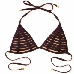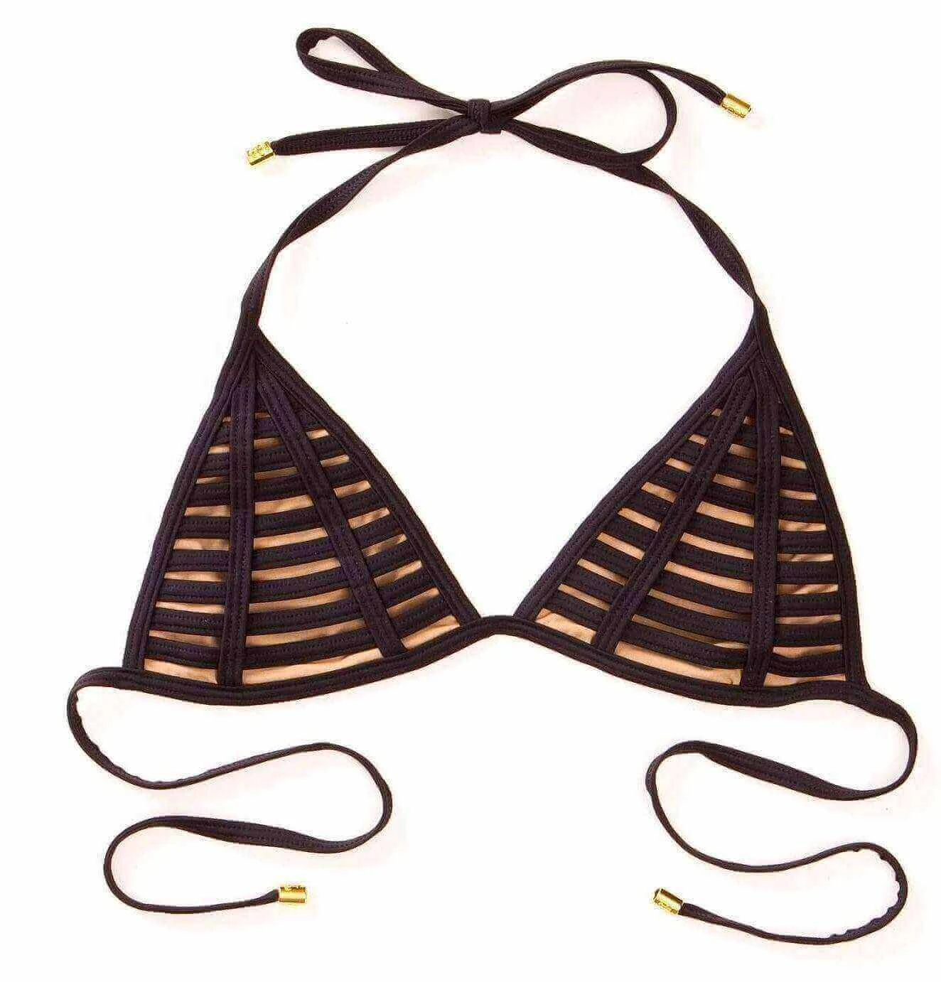 - Fixed triangle top with rows of binding and nude lining to give the illusion of skin.