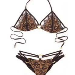This is one of the best selling Beach Bunny bikinis of all time!! This gorgeous and sexy triangle top has golden metal ring accents and beautiful black lace overlay and trim.Â