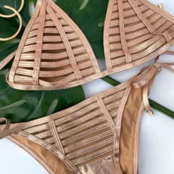 Our Hard Summer group is definitely one of our sexiest bikinis. The rows of binding and nude lining to give the illusion of skin. This set is special as it has a metallic coating to give it some bling.