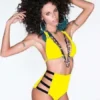 Hot, sexy, and strappy is this barely there bikini set. Beautifulย purple fabric highlighted with o-ring connectors on the top and mid section. Top is a halter neck style and the bottom mid-section straps and is an open butt design for maximum tanning.ย This is not for the timid!
