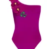 Classic one piece swimsuit with a deep v-neckline, parallel straps, and a back tie. This piece is a Brasilian cut bottom for a flattering fit.
