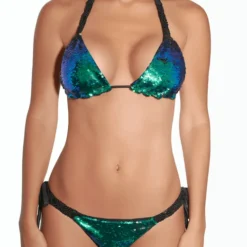 Go from laps to lounging in no time with this amazing bikini! The top and bottom includes a sequin fabric and a cute macrame on the straps, The bottom features cutout sides on the hips with gathering on the rear to naturally lift your butt.