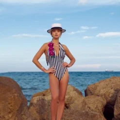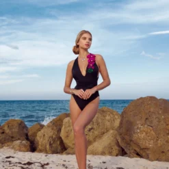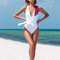 A plunging neckline adds allure to a sultry Oncidium swimsuit featuring a cutout neckline with 3D orchid embroidery and crisscrosses ties at the waist.
