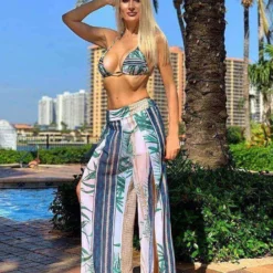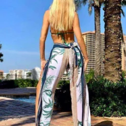 Feel nature in this beautiful Saona pant. These luxurious pants feature high leg slits, elastic waistband, and a waste wrap that ties in the rear. This pant is perfect for the beach or resort.