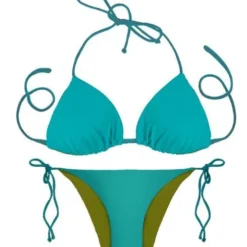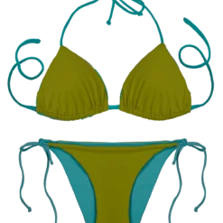 Solid aqua blue bikini and a 2nd bikini in 1 reverses to a solid soft olive-green hued in a to die for 2nd skin-like fabric.Fully reversible, you are getting 2 complete blue glue bikini looks in one!
