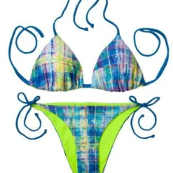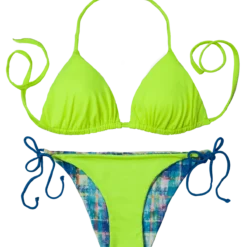 The blue glue bikini take on madras pattern in green blues and lavender hues. Reverse your bikini and don this solid lime green bikini for your 2nd blue glue look!